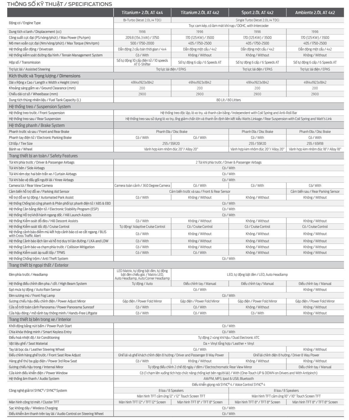 Thông số Titanium+ 2.0L AT 4x4 Titanium 2.0L AT 4x2 Sport 2.0L AT 4x2 Ambiente 2.0L AT 4x2