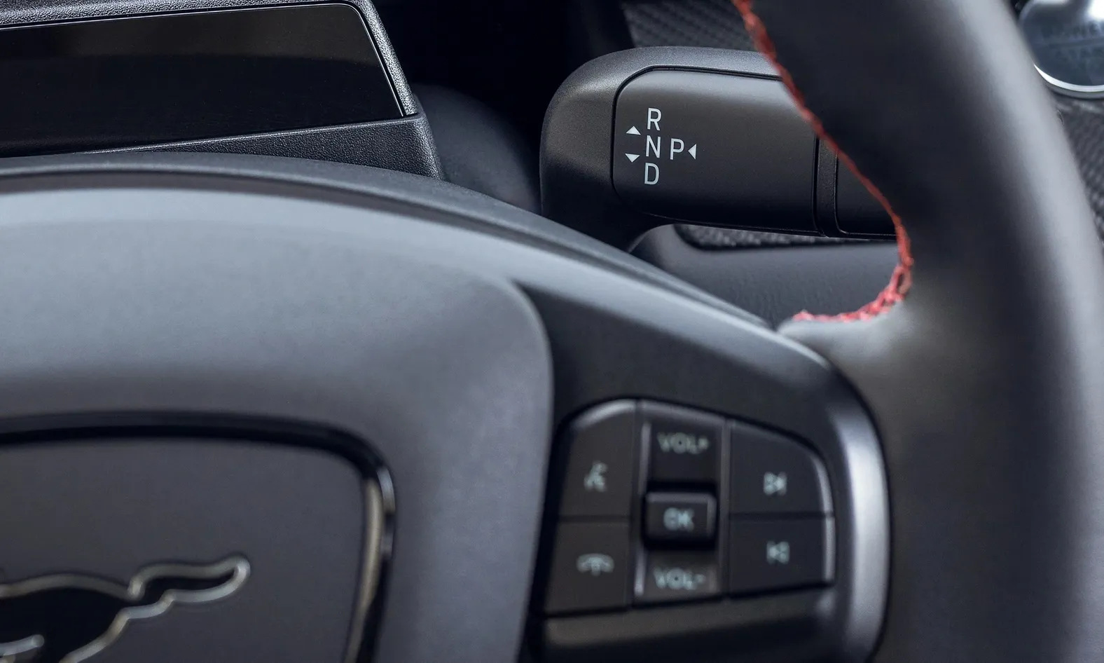 Vô-lăng xe dạng 3 chấu bọc da, tích hợp nhiều phím chức năng tiện dụng và có lẫy chuyển số. Ngay chính giữa xuất hiện logo hình ngựa chồm vô cùng mạnh mẽ.