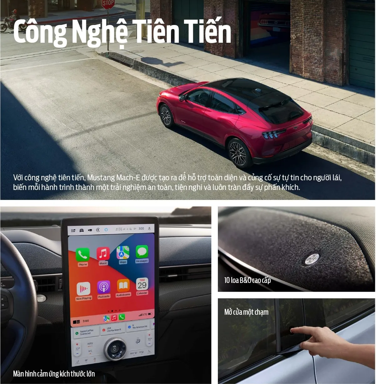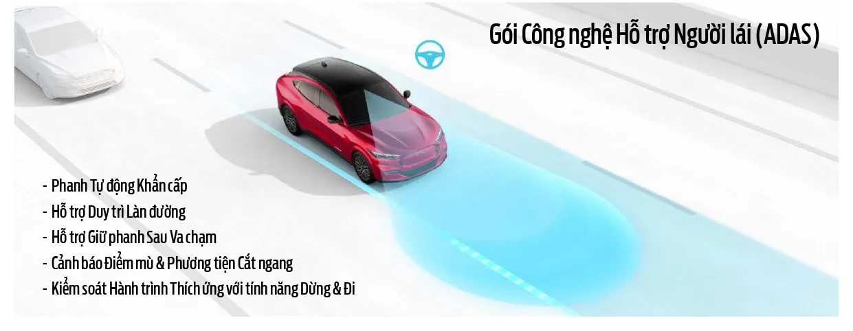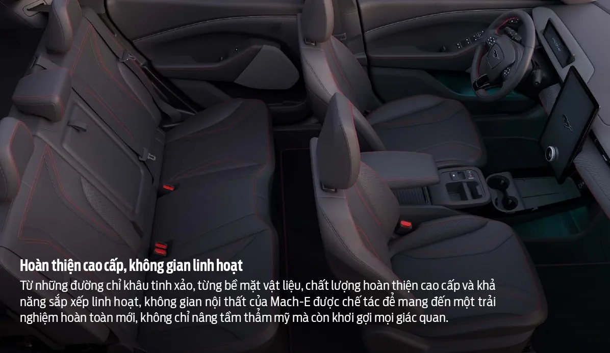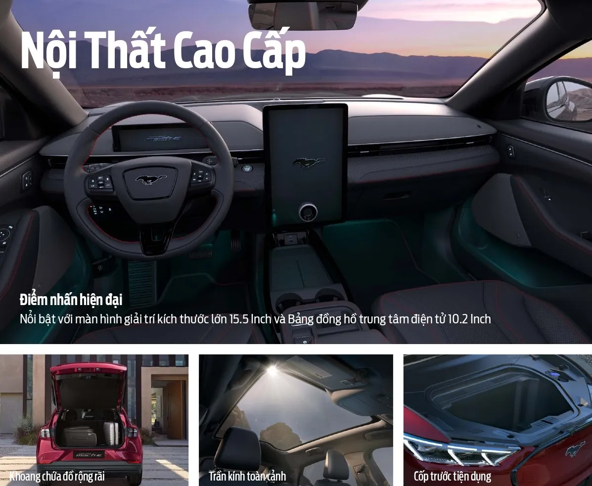 Mustang Mach-E là mẫu xe SUV thuần điện hiệu năng cao đầu tiên của Ford được giới thiệu tại Việt Nam vào tháng 8/2025, với phiên bản Premium AWD được niêm yết giá 2,599 tỷ đồng. Xe có khả năng tăng tốc 0-100 km/h chỉ trong 4,5 giây, phạm vi hoạt động 550 km (WLTP) và được trang bị nhiều công nghệ hiện đại như màn hình cảm ứng 15,5 inch, hệ thống âm thanh B&O, cùng các tính năng hỗ trợ lái tiên tiến.